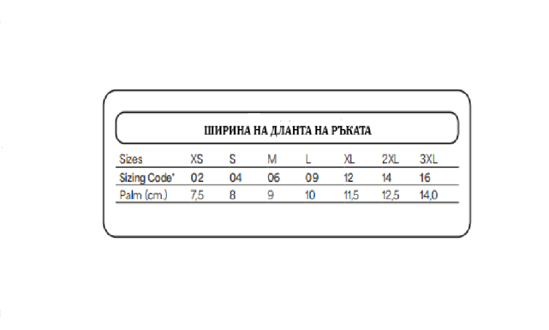 Бележка: Моля, измерете ширината на дланта си, за да определите нужния Ви размер. След това сравнете с дадената таблица в снимката.
